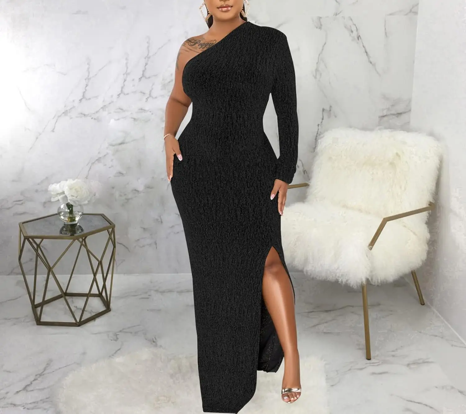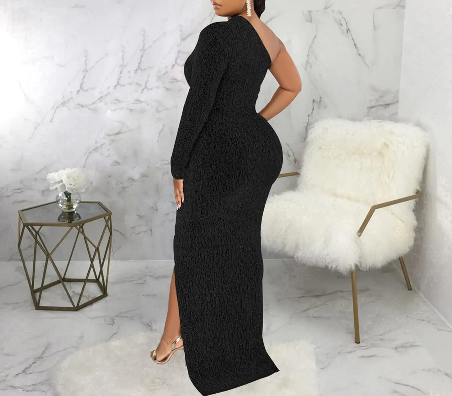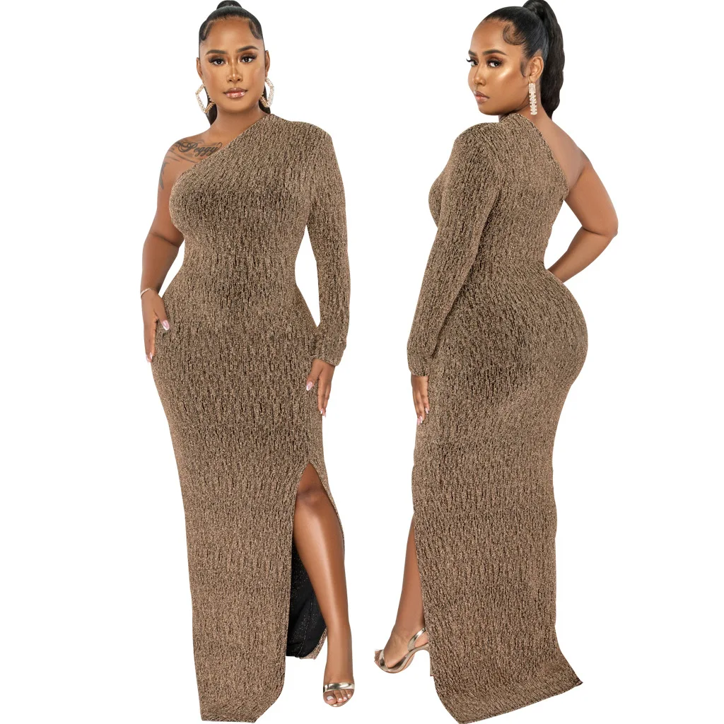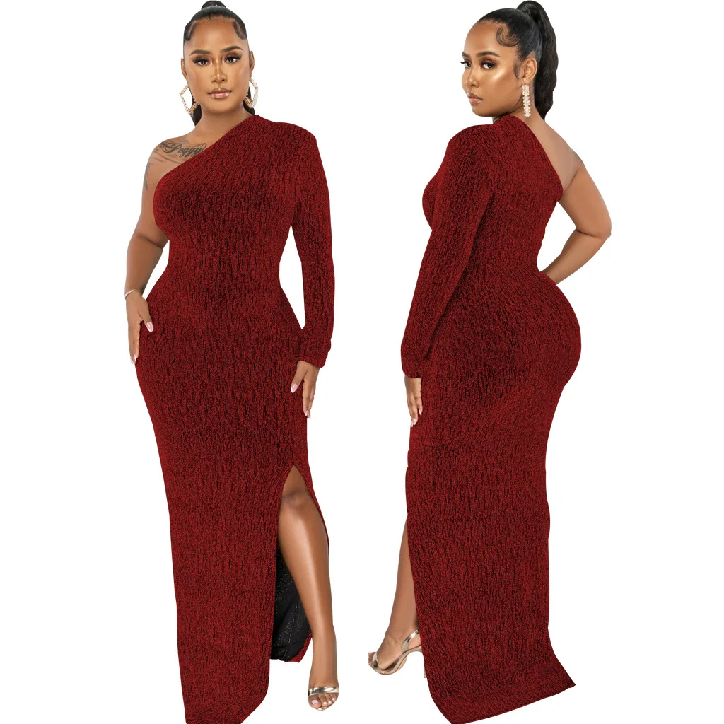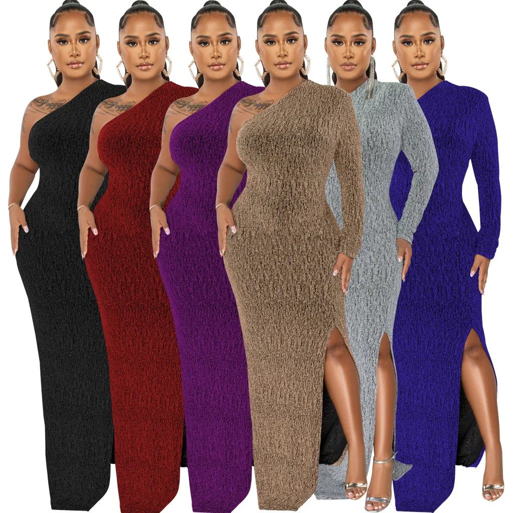 Women's Formal Evening Gowns Elegant Sparkly One Shoulder A-Line Floor-Length Maxi Dresses Sexy Long Sleeve High Split Party